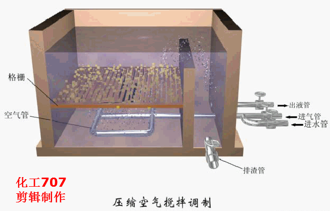 壓縮空氣攪拌調(diào)制 ?空氣攪拌一般是在池底設(shè)置穿孔管,穿孔管與鼓風(fēng)機(jī)空氣管路相連,利用壓縮空氣進(jìn)行曝氣攪拌。其主要工作原理是利用空氣與池內(nèi)水體接觸,攪動(dòng)水體以防止水體中的懸浮物下沉,加速空氣中的氧向水體轉(zhuǎn)移,完成充氧目的。此外,也加強(qiáng)了有機(jī)物、微生物與溶解氧的接觸,對(duì)污水中有機(jī)物進(jìn)行氧化分解。