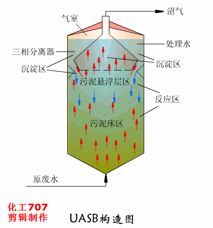 UASB構(gòu)造圖 ?UASB是(Up-flow Anaerobic Sludge Bed/Blanket)的英文縮寫(xiě)。名叫上流式厭氧污泥床反應(yīng)器,是一種處理污水的厭氧生物方法,又叫升流式厭氧污泥床。 污水自下而上通過(guò)UASB,反應(yīng)器底部有一個(gè)高濃度、高活性的污泥床,污水中的大部分有機(jī)污染物在此間經(jīng)過(guò)厭氧發(fā)酵降解為甲烷和二氧化碳。 因水流和氣泡的攪動(dòng),污泥床之上有一個(gè)污泥懸浮層。反應(yīng)器上部有設(shè)有三相分離器,用以分離消化氣、消化液和污泥顆粒。消化氣自反應(yīng)器頂部導(dǎo)出;污泥顆粒自動(dòng)滑落沉降至反應(yīng)器底部的污泥床;消化液從澄清區(qū)出水。UASB 負(fù)荷能力很大,適用于高濃度有機(jī)廢水的處理。運(yùn)行良好的UASB有很高的有機(jī)污染物去除率,不需要攪拌,能適應(yīng)較大幅度的負(fù)荷沖擊、溫度和pH變化。