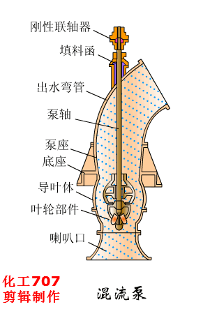 混流泵 ?混流泵是介于離心泵和軸流泵之間的一種泵?;炝鞅玫谋绒D(zhuǎn)速高于離心泵,低于軸流泵,一般在300-500之間。它的揚(yáng)程比軸流泵高,但流量比軸流泵小,比離心泵大。