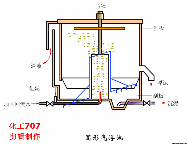 圓形氣浮池 ?氣浮池是指一種主要是運(yùn)用大量微氣泡撲捉吸附細(xì)小顆粒膠黏物使之上浮,達(dá)到固液分離的效果的池子。圓形氣浮池稱(chēng)為超效淺層氣浮,是目前市場(chǎng)上最先進(jìn)的氣浮機(jī),主要是是運(yùn)用了淺池理論和零速度原理,及高效運(yùn)用了國(guó)際先進(jìn)的微氧化技術(shù)和高密度的離子氣泡技術(shù),改變了水的表面張力,大規(guī)模的提升了水中的溶解氧,大量的吸附了水中的短鏈有機(jī)物分子和有色基團(tuán),取得了生化和物化都難以降解的COD的技術(shù)突破。