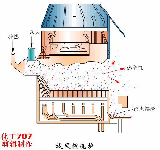 旋風(fēng)燃燒爐 ?旋風(fēng)鍋爐利用高速旋轉(zhuǎn)的空氣流使煤粒高速度旋轉(zhuǎn)并強(qiáng)烈燃燒的圓筒形燃燒室(爐膛)。旋風(fēng)爐可用于鍋爐等設(shè)備。氣流的高速旋轉(zhuǎn)作用將煤粒拋向筒壁,煤粒在筒壁和筒壁附近的空間內(nèi)燃燒,形成一個(gè)溫度很高的區(qū)域,使灰渣溶化而粘在筒壁上。