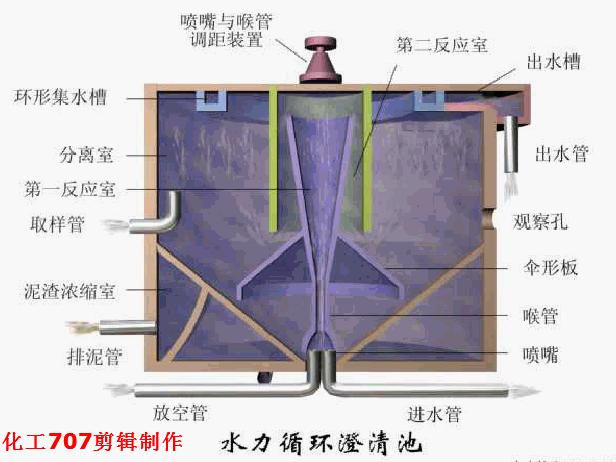 水力循環(huán)澄清池 ?水力循環(huán)澄清池:在水射器的作用下,將池中的活性泥渣吸入和原水充分混合,從而加強(qiáng)了水中固體顆粒間的接觸和吸附作用,形成良好的絮凝,加速了沉降速度使水得到澄清。