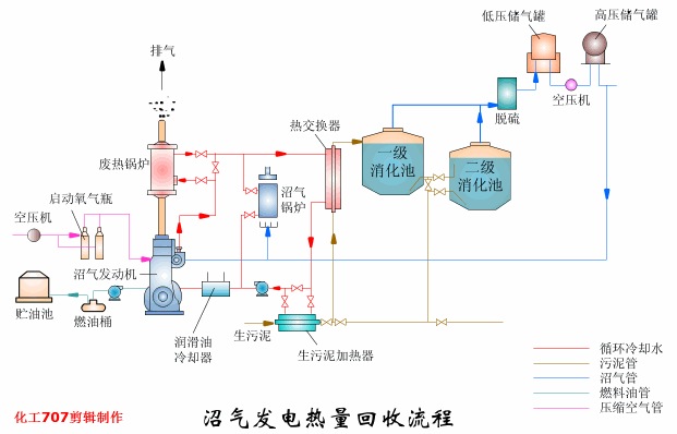 沼氣發(fā)電熱量回收流程 ?沼氣發(fā)電系統(tǒng)能積極、有效地利用沼氣,可以將沼氣中約30%的能量變?yōu)殡娏Γ?0%的能量變?yōu)闊崮?。在污水處理廠中可利用這一熱量給消化池進(jìn)行加熱。