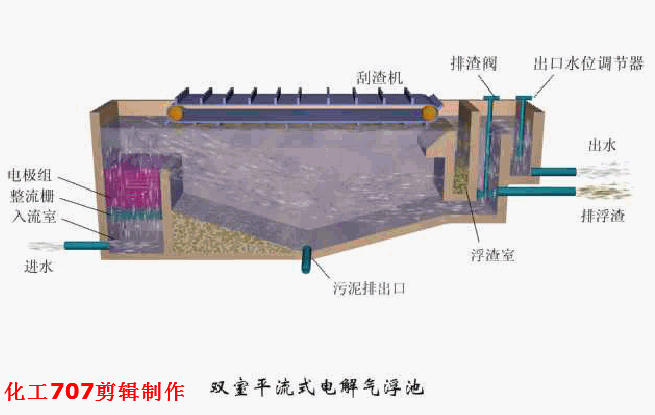 雙室平流式電解氣浮池 ?氣浮原理:把空氣通入被處理的水中,并使之以微小氣泡形式析出而成為載體,從而使絮凝體黏附在載體氣泡上,并隨之浮升到水面,形成泡沫浮渣(氣、水、顆粒三相混合體)從水中分離出去。
