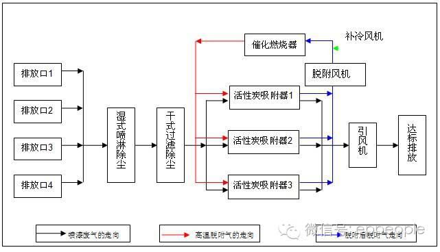 【廢氣】風(fēng)量大、濃度低VOC處理工藝發(fā)表時(shí)間:2016-08-08 00:03 關(guān)于大風(fēng)量低濃度的有機(jī)廢氣的處理工藝 在集裝箱制造行業(yè)中漆房和烘房等車間;印刷行業(yè)中印刷,涂布等車間;電子制造行業(yè)中焊接,烘干等工藝;及其他行業(yè)產(chǎn)品的生產(chǎn)過(guò)程中,由于有機(jī)溶劑的揮發(fā)產(chǎn)生大量的有機(jī)廢氣,需凈化達(dá)標(biāo)后才可排放。其特點(diǎn)往往是,車間廢氣風(fēng)量大20000m3 一般有機(jī)廢氣的治理的方法有吸收法 ,吸附法,直接燃燒法,催化燃燒法,冷凝回收法等等。但是對(duì)于大風(fēng)量,低濃度的有機(jī)廢氣,以上各法均有弊端。 吸收法。本法適合于溫度低、中高濃度的廢氣。尋找性價(jià)比高的,高效的低揮發(fā)性吸收液也比較難,同時(shí)還存在二次污染,凈化效果也不理想。 活性碳直接吸附。凈化效果好,但是運(yùn)營(yíng)成本會(huì)很高,因?yàn)橐蠼?jīng)常更換活性炭以保證凈化效果,并且換碳過(guò)程中造成二次污染。 直接燃燒。適合高濃度、小風(fēng)量廢氣治理。不容易控制和掌握,對(duì)運(yùn)行技術(shù)要求高。對(duì)大風(fēng)量低濃度的廢氣治理,能耗非常大,運(yùn)行成本高。 催化燃燒。適合高溫或高濃度的有機(jī)廢氣治理,國(guó)內(nèi)技術(shù)成熟,使用經(jīng)驗(yàn)廣泛。節(jié)約能源;凈化率高,工藝簡(jiǎn)單,操作方便,安全性好。但是不適用于低濃度的廢氣治理。 冷凝回收。對(duì)于成份相對(duì)單一,濃度高的有機(jī)廢氣,還是有很大的優(yōu)勢(shì),回收利用價(jià)值也很高,能創(chuàng)造具大回收效益。 現(xiàn)在普遍用的方法是:吸附---催化燃燒法 。此方法結(jié)合了直接吸附法和催化燃燒法各自的優(yōu)點(diǎn),避免了弊端,適用于大風(fēng)量低濃度的有機(jī)廢氣治理,運(yùn)行成本低,技術(shù)實(shí)用,成熟。 工藝原理: 用活性炭對(duì)有機(jī)廢氣進(jìn)行吸附,吸附接近飽和后引入熱空氣對(duì)熱活性炭進(jìn)行脫附再生。利用熱空氣解析出的有機(jī)廢氣引入催化燃燒床進(jìn)行無(wú)焰燃燒凈化處理,處理后的潔凈氣體達(dá)標(biāo)排放。熱氣體可通過(guò)熱交換再做為脫附熱風(fēng)在系統(tǒng)中循環(huán)使用。 具體工藝流程說(shuō)明 (1)預(yù)處理 因廢氣中含有大量漆霧及一定量的塵雜,若未經(jīng)去除直接進(jìn)入吸附裝置,極易造成吸附材料的微孔堵塞,嚴(yán)重影響吸附效果、增加系統(tǒng)阻力、影響通風(fēng)效果甚至給系統(tǒng)造成安全隱患。 預(yù)處理過(guò)程去除了廢氣中的細(xì)微粉塵、雜物或粘性漆霧等,保障活性炭無(wú)堵塞,使吸附過(guò)程正常運(yùn)行。 (2)吸附 經(jīng)預(yù)處理的廢氣進(jìn)入到吸附階段,用活性炭將廢氣中的有機(jī)成份吸附在內(nèi)部微孔結(jié)構(gòu)中,凈化后的潔凈氣體通過(guò)煙囪達(dá)標(biāo)排放。每套裝置設(shè)二至四臺(tái)吸附裝置,即一臺(tái)吸附裝置處于脫附再生階段或備用階段外,其它吸附裝置處于吸附階段,吸附脫附循環(huán)連續(xù)進(jìn)行,從而使凈化系統(tǒng)可連續(xù)運(yùn)行,可配合業(yè)主生產(chǎn)。 (3)脫附-催化燃燒 達(dá)到飽和狀態(tài)的吸附裝置停止吸附,進(jìn)入脫附狀態(tài),此進(jìn)啟動(dòng)催化燃燒床預(yù)熱系統(tǒng)對(duì)催化劑進(jìn)行預(yù)熱,同時(shí)產(chǎn)生一定量的熱空氣,當(dāng)床層溫度達(dá)到設(shè)定值時(shí)將熱空氣送入吸附裝置,活性炭受熱解析出高濃度的有機(jī)氣體,由風(fēng)機(jī)引入催化燃燒床,在貴金屬催化劑的作用下于一個(gè)較低的溫度下進(jìn)行無(wú)焰催化燃燒,將有機(jī)成分轉(zhuǎn)化為無(wú)毒、無(wú)害的CO2 和H2O,同時(shí)釋放出大量的熱量,可維持催化燃燒所需的起燃溫度,使廢氣燃燒過(guò)程基本不需外加的能耗(電能),并將部分熱量回用于吸附裝置內(nèi)活性炭的解析再生,從而大大降低了能耗。 工藝改進(jìn): 1.在吸附材料上選用新型吸附材料--蜂窩狀活性炭。其特點(diǎn)是空氣動(dòng)力學(xué)性突出流速在1.5-2m/t,使得吸附脫速率快脫附解析完全,財(cái)生吸附率衰減慢,孔壁薄阻力較小,較高的強(qiáng)度,比表面積大,吸附能力強(qiáng),成本相對(duì)低廉,使用壽命長(zhǎng)。 2.催化劑選用高活性貴金屬催化劑。 3.采用吸附,脫附濃縮的工藝。將原本風(fēng)量大,溶度低的有機(jī)廢氣濃縮后,變成高濃度的有機(jī)廢氣再進(jìn)行催化燃燒,大大的降低了直接催化燃燒的能耗。燃燒效率高,凈化徹底。 5.吸附脫附系統(tǒng)獨(dú)立,實(shí)現(xiàn)脫附吸熱與燃燒放熱的平恒。 4. 利用催化燃燒余熱回用系統(tǒng),將催化燃燒時(shí)產(chǎn)生的熱量根據(jù)業(yè)主的具體需求回收利用,如回用在給烘房提供熱量。達(dá)到真正意義上的“節(jié)能減排”循環(huán)經(jīng)濟(jì)目的。 大風(fēng)量低濃度有機(jī)廢氣凈化技術(shù) 2、 吸附凈化濃縮+催化燃燒脫附技術(shù)應(yīng)用實(shí)例 大風(fēng)量低濃度廢氣治理工藝流程圖 工藝說(shuō)明:① 單間自動(dòng)噴漆房的排風(fēng)量為30000m3/h,共4間噴漆房4個(gè)排氣口;② 噴漆廢氣的凈化工藝是先經(jīng)過(guò)濕式噴淋除塵和干式脫水除塵后,再經(jīng)過(guò)活性炭吸附后實(shí)現(xiàn)達(dá)標(biāo)排放;③ 經(
