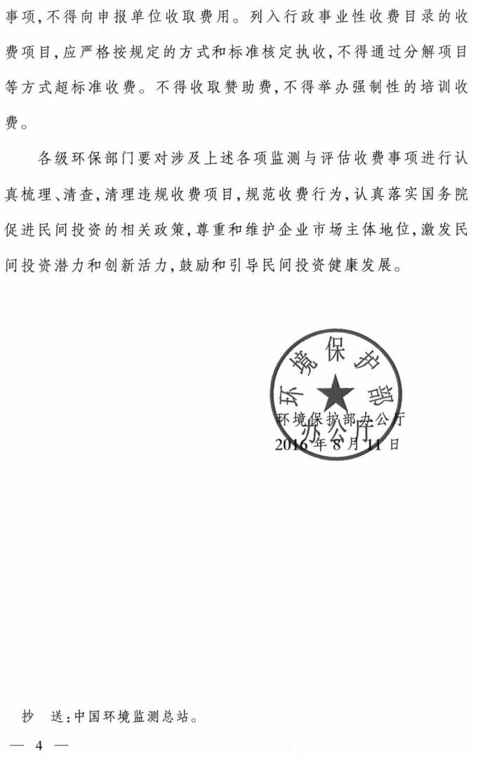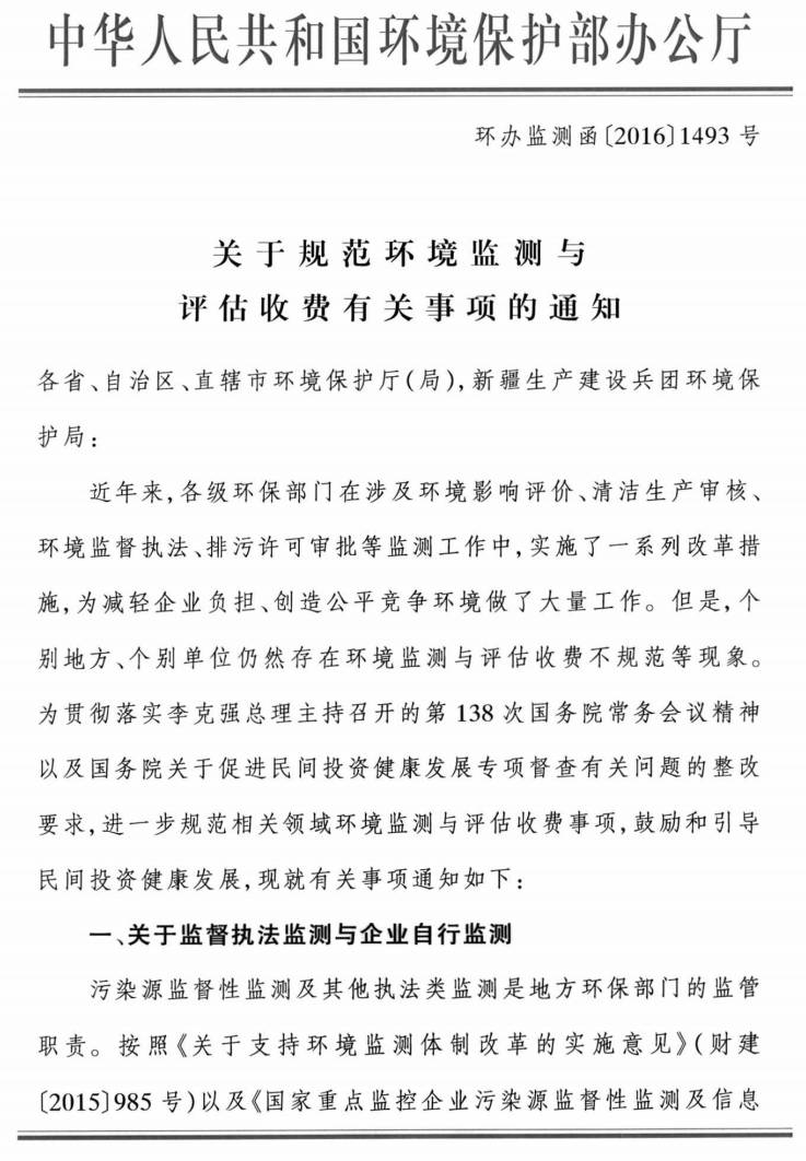 為規(guī)范環(huán)保部門在涉及環(huán)境影響評價、清潔生產審核、環(huán)境監(jiān)督執(zhí)法、排污許可審批等監(jiān)測工作中的收費行為,環(huán)保部下發(fā)了 《關于規(guī)范環(huán)境監(jiān)測與評估收費有關事項的通知》(環(huán)辦監(jiān)測函〔2016〕1493號)。現將該《通知》轉發(fā)給你們,請遵照執(zhí)行。