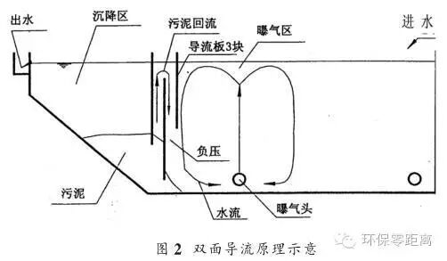 兩面導(dǎo)流在氧化溝生物活性污泥處理技術(shù)的基礎(chǔ)上,對(duì)污泥的回流系統(tǒng)進(jìn)行了改進(jìn)。利用微孔曝氣管,在曝氣時(shí)產(chǎn)生的上升氣流帶動(dòng)水產(chǎn)生的水流,形成向上的弧線運(yùn)動(dòng)在兩塊導(dǎo)流槽夾縫間形成負(fù)壓,該負(fù)壓讓污泥由沉淀區(qū)自動(dòng)回流到好氧區(qū),這樣就取代了二沉池的水泵回流。同時(shí)導(dǎo)流槽將好氧池分隔成好氧區(qū):曝氣區(qū)和沉淀區(qū),污水和污泥在水流及導(dǎo)流槽的帶動(dòng)下在好氧區(qū)和沉淀區(qū)間自動(dòng)循環(huán);污泥在沉淀區(qū)溶氧量降低形成了兼氧區(qū);污泥經(jīng)過反復(fù)的好氧和兼氧,形成了硝化和反硝化處理工序,因此具有較強(qiáng)的降解氨氮的能力;將氧化溝好氧曝氣、二沉池、污泥回流集中在一個(gè)好氧處理池內(nèi)自動(dòng)完成,并且不利用泵回流,利用水流回流污泥不把好氧區(qū)內(nèi)形成的好氧生物團(tuán)打碎,從而提高了好氧生物團(tuán)的處理能力。因此兩面導(dǎo)流具有高效的降解COD及氨氮的處理能力,不用人為控制污泥的回流比。