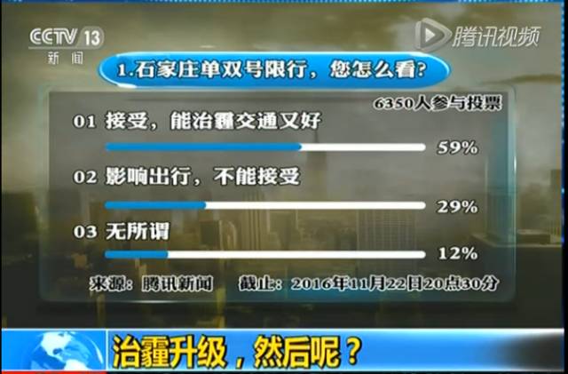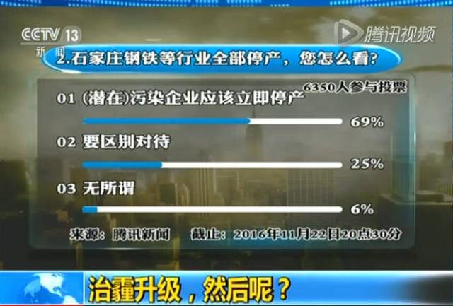 中央電視臺(tái)新聞1+1 :治霾升級(jí),然后呢!發(fā)表時(shí)間:2016-11-29 10:34 11月17日,石家莊推出史上最強(qiáng)治污措施——從2016年11月17日~12月31日,鋼鐵等7大行業(yè)全部停產(chǎn),主城區(qū)實(shí)行機(jī)動(dòng)車(chē)單雙號(hào)限行,各單位錯(cuò)時(shí)上下班。 那么,問(wèn)題來(lái)了, 石家莊七大行業(yè)的企業(yè)到底停了沒(méi)有? 企業(yè)停產(chǎn)后,工人工資怎么發(fā)? 關(guān)于停產(chǎn)限行,群眾有哪些聲音? 看完下面的視頻您或許就有答案了: 新聞1+1 治霾升級(jí),然后呢? 解說(shuō):鋼鐵、火電、化工、制藥、水泥、玻璃、陶瓷、鈣鎂,石家莊決戰(zhàn)45天,近千家企業(yè)最大限度關(guān)停限產(chǎn)。 靈壽冀 東水泥有限責(zé)任公司環(huán)保部部長(zhǎng) 李可:停產(chǎn)準(zhǔn)備一般是大概3到4小時(shí)之內(nèi),我們要把生產(chǎn)線(xiàn)全部停下來(lái)。 2016年11月17日新聞: 采取超常措施,狠抓落實(shí),敢于出手,敢于亮劍,嚴(yán)防死守,決戰(zhàn)45天,確保大氣污染治理取得明顯好轉(zhuǎn)。 解說(shuō):完成指標(biāo),超常措施,全力以赴?!缎侣?+1》今日關(guān)注:治霾升級(jí),然后呢? 評(píng)論員 白巖松:您好觀(guān)眾朋友,歡迎收看正在直播的《新聞1+1》。 今天節(jié)目一開(kāi)始,咱們先來(lái)關(guān)注石家莊今天的PM2.5,有點(diǎn)奇怪是嗎,咱們先說(shuō),來(lái)先關(guān)注它的PM2.5,然后再揭曉答案,為什么要關(guān)注它。我們看今天石家莊PM2.5,中午一點(diǎn)鐘的時(shí)候,PM2.5的指數(shù)是66,這對(duì)于一個(gè)經(jīng)常處于大氣污染狀態(tài)的城市來(lái)說(shuō),這66已經(jīng)是相當(dāng)不錯(cuò)的數(shù)據(jù)了,所以你看石家莊人民已經(jīng)開(kāi)始曬藍(lán)天了。尤其拿前面這個(gè)小紅果來(lái)當(dāng)一個(gè)前景的話(huà),這藍(lán)天顯得格外的漂亮。 為什么要去關(guān)注它呢,因?yàn)閺纳闲瞧陂_(kāi)始,也就是從17號(hào)開(kāi)始做出決定,石家莊實(shí)施了史上以來(lái)最嚴(yán)厲的來(lái)治理大氣污染的一種行動(dòng),為什么要說(shuō)最嚴(yán)厲呢?從17號(hào)開(kāi)始做出決定,一直到今年的12月31號(hào),也就是說(shuō)到年底,全面實(shí)行機(jī)動(dòng)車(chē)單雙號(hào)的限行,同時(shí)像鋼鐵、水泥等等一些企業(yè)近千家,都要接到通知,三個(gè)小時(shí)后就停產(chǎn)。其實(shí)不僅石家莊,我們?cè)賮?lái)看看今天蘭州的PM2.5,看著有點(diǎn)灰,但其實(shí)71也還算不錯(cuò)了,蘭州也實(shí)行了進(jìn)來(lái)比較嚴(yán)厲的單雙號(hào)的限行。為什么這些城市開(kāi)始實(shí)施了日?;臉O其嚴(yán)厲的這樣一種治霾的措施,是否意味著由過(guò)去治霾我們付出小的代價(jià),取得小的成果,全面向現(xiàn)在付出大的代價(jià),要取得大的成果這樣的一個(gè)階段來(lái)轉(zhuǎn)變呢,來(lái),我們一起從石家莊開(kāi)始觀(guān)察。 解說(shuō):“枝枝紅豆俏寒冬”、“美麗的天氣,就是太冷了”,今天的石家莊,大風(fēng)降溫帶來(lái)了一個(gè)難得的好天氣。很多人在自己的朋友圈,紛紛記錄下這個(gè)城市的藍(lán)天。58,這是截止到今天下午六點(diǎn),石家莊PM2.5的平均指數(shù)。 石家莊市民:今天感覺(jué)出來(lái)空氣好多了,感覺(jué)石家莊市做得限行限號(hào)挺管用。 解說(shuō):今天,在石家莊的路面上奔跑的汽車(chē),尾號(hào)均是雙號(hào),石家莊市所有的變化,均來(lái)源于11月17日晚,石家莊市緊急公布的治污方案。方案中稱(chēng),從11月17日到今年年底,石家莊市主城區(qū)實(shí)行機(jī)動(dòng)車(chē)單雙號(hào)限行,限行期間城市公交車(chē)免費(fèi)乘坐,石家莊全市所有行政性機(jī)關(guān)及事業(yè)單位,實(shí)行“朝九晚五”錯(cuò)時(shí)上下班制度。 石家莊市私家車(chē)主:限號(hào)麻煩死了。 記者:怎么個(gè)麻煩。 私家車(chē)主:天天你讓我怎么辦,原來(lái)限2 5好說(shuō)我怎么著停一天就行了,現(xiàn)在我一天一天,天天坐公交車(chē),我這特別遠(yuǎn),上班不方便。 石家莊市私家車(chē)主:我覺(jué)得挺好的,然后市里面也不堵了,空氣還好了。 解說(shuō):除了車(chē)輛限號(hào),石家莊市區(qū)除承擔(dān)居民供暖和保民生等重點(diǎn)任務(wù)的生產(chǎn)線(xiàn)外,全市所有鋼鐵、水泥、焦化、鑄造、玻璃、陶瓷、鈣鎂等7大行業(yè),全部停產(chǎn)。 靈壽冀東水泥有限責(zé)任公司環(huán)保部部長(zhǎng) 李可:按照預(yù)案指令通知相關(guān)部門(mén)進(jìn)行各工序的停產(chǎn)準(zhǔn)備,一般是大概3到4小時(shí)之內(nèi),我們要把生產(chǎn)線(xiàn)全部停下來(lái)。 解說(shuō):石家莊的這家水泥企業(yè),日生產(chǎn)水泥量大約在4500噸,現(xiàn)在生產(chǎn)線(xiàn)已經(jīng)停止運(yùn)轉(zhuǎn),除了相應(yīng)的值班人員留守外,其他員工已全部放假,放假員工的工資,也將按照不低于河北省最低生活標(biāo)準(zhǔn)予以發(fā)放。 李可:如果我們正常生產(chǎn)的話(huà),我們大概停產(chǎn)是一天損失是100多萬(wàn)。雖然說(shuō)是企業(yè)損失了點(diǎn)利潤(rùn),但是為了咱們河北省的天氣狀況,企業(yè)也應(yīng)該盡到相應(yīng)的社會(huì)責(zé)任。 解說(shuō):除了各種措施之外,石家莊市出臺(tái)的這份緊急治污方案還提到一個(gè)明確的目標(bi