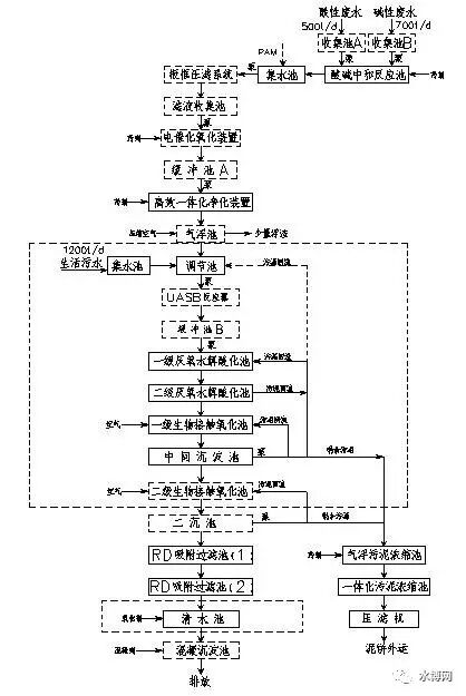 多晶硅生產(chǎn)廢水處理改造工藝說明發(fā)表時(shí)間:2017-03-30 00:24 針對多晶硅生產(chǎn)廢水實(shí)際的水質(zhì)水量情況以及存在的各類問題,通過反復(fù)研究論證,擬從以下幾方面對現(xiàn)有處理設(shè)施進(jìn)行改造。 1、分類收集,增加綜合預(yù)處理 目前多晶硅生產(chǎn)廢水中酸性廢水及堿性廢水無收集設(shè)施,此兩類廢水的特點(diǎn)為間歇性,水質(zhì)波動(dòng)較大,若兩者直接進(jìn)入酸堿中和反應(yīng)池進(jìn)行中和反應(yīng)易造成混合水質(zhì)的波動(dòng),因此針對此問題本方案對酸性廢水及堿性廢水進(jìn)行分類單獨(dú)收集,對兩類廢水進(jìn)行水質(zhì)水量的調(diào)節(jié),這樣有利于后續(xù)處理水質(zhì)的穩(wěn)定,并能夠保證酸堿中和效果。 由于廢水中含有大量膠狀懸浮物,經(jīng)中和沉淀后會(huì)進(jìn)一步產(chǎn)生懸浮物,若用沉淀進(jìn)行泥水分離的方法實(shí)際證明會(huì)產(chǎn)生排泥堵塞等一系列問題,因此本方案在生產(chǎn)廢水中和沉淀處理后進(jìn)行用泵打入板框壓濾機(jī)進(jìn)行泥水分離,這樣可以保證泥水的及時(shí)分離,期間產(chǎn)生的污泥也可以及時(shí)外運(yùn)處置,不會(huì)帶來排泥堵塞的問題。另外,由于生產(chǎn)廢水可生化性極差,若缺乏針對性的預(yù)處理設(shè)施,將對后續(xù)生化系統(tǒng)帶來沖擊。因此本方案經(jīng)試驗(yàn)及討論研究,決定采用電催化氧化的處理方法對該生產(chǎn)廢水進(jìn)行綜合預(yù)處理,電催化氧化法是處理高濃度、難降解、有毒有害有機(jī)廢水的創(chuàng)新型產(chǎn)品,對高分子、多基團(tuán)、結(jié)構(gòu)穩(wěn)定、難降解、有毒、有害的有機(jī)物降解具有獨(dú)特的優(yōu)勢。該法基于電化學(xué)技術(shù)原理,利用電解催化反應(yīng)過程中生成的強(qiáng)氧化粒子(?OH、?O2、H2O2等),與廢水中的有機(jī)污染物無選擇的快速發(fā)生鏈?zhǔn)椒磻?yīng),進(jìn)行氧化降解,可大大提高廢水的可生化性,保證后續(xù)生化效果。 2、強(qiáng)化生化處理系統(tǒng),降低負(fù)荷,增加營養(yǎng) 由于生產(chǎn)廢水進(jìn)水COD濃度較高,就目前生化系統(tǒng)來看,厭氧水解酸化池及接觸氧化池池容較小,處理負(fù)荷過高,因此本方案針對目前的水質(zhì)的特點(diǎn),通過生化系統(tǒng)進(jìn)水前及生化系統(tǒng)本身兩方面著手來降低生化系統(tǒng)的處理負(fù)荷,確保生化系統(tǒng)的穩(wěn)定運(yùn)行,主要方案為:○1在調(diào)節(jié)池接入生活污水,提高廢水的可生化性并降低綜合廢水的COD濃度及含鹽量;○2在現(xiàn)有一級厭氧水解酸化池前端增設(shè)UASB反應(yīng)器。因?yàn)閁ASB反應(yīng)器的容積負(fù)荷率較高,抗沖擊負(fù)荷能力強(qiáng),COD去除率高,出水水質(zhì)穩(wěn)定性較好,因此選用UASB反應(yīng)池作為厭氧處理構(gòu)筑物。○3擴(kuò)大現(xiàn)有生化系統(tǒng)容積,特別是后續(xù)生物接觸氧化池的容積,降低生化系統(tǒng)有機(jī)負(fù)荷○4另外,由于廢水可生化性較差,廢水中營養(yǎng)成分缺乏,因此調(diào)節(jié)池中加裝潛水?dāng)嚢铏C(jī)用以調(diào)節(jié)來水水量水質(zhì)的不均勻性,且在調(diào)節(jié)池投加營養(yǎng)鹽保證后續(xù)生化處理。 首先需要強(qiáng)化的是現(xiàn)有水解酸化池,適當(dāng)設(shè)計(jì)的進(jìn)水分配系統(tǒng)對于一個(gè)運(yùn)轉(zhuǎn)良好的水解系統(tǒng)是至關(guān)重要的,進(jìn)水系統(tǒng)需要兼有配水和水利攪拌的功能,配水時(shí)需確保各單位面積的進(jìn)水量基本相同,以防止短路等現(xiàn)象發(fā)生,并盡可能滿足水利攪拌的需要,保證進(jìn)水有機(jī)物與污泥迅速混合。水解酸化池配水方式主要有一管一孔、一管多孔、分枝配水等配水方式,由于原水解酸化池為上下折流式廊道池型,水解酸化池布水不均,泥水混合效果較差,因此存在污泥沉積、泥水不能充分接觸等問題,本方案在我公司多年相關(guān)經(jīng)驗(yàn)的基礎(chǔ)上,著重通過改變池型(將廊道去除),特別是變更布水方式(改為脈沖式布水方式)來改善池體水利條件,提高泥水接觸面積,充分發(fā)揮水解酸化的效果,以提高其對大分子物質(zhì)的去除效率,在去除部分COD的同時(shí),大分子物質(zhì)也轉(zhuǎn)化成小分子物質(zhì),提高了B/C比,也有利于后續(xù)好氧生物處理。 其次原好氧生物處理采用的是生物接觸氧化法,據(jù)實(shí)地考察,生物接觸氧化池污泥發(fā)黑,溶解氧顯然不足,這跟曝氣方式有關(guān),原曝氣方式選用的是射流式曝氣充氧,由于目前常規(guī)射流曝氣器充氧能力和動(dòng)力效率還較低,限制了該技術(shù)的推廣應(yīng)用。在實(shí)際工程中,射流曝氣工藝容易形成死角和短流,而且在喇叭口處由于汽水沖擊力較大而導(dǎo)致生物膜脫落。射流曝氣還易形成曝氣不均現(xiàn)象,造成有些區(qū)域曝氣過量而有些區(qū)域則明顯曝氣不足的現(xiàn)象,而且相對微孔曝氣方式投資及能耗也相對較高。因此本方案通過對多種曝氣方式的綜合考察研究,綜合其實(shí)際運(yùn)用情況,決定采用膜片式微孔曝氣器代替原有射流曝氣器,膜片曝氣器擴(kuò)散氣泡直徑小,氣液界面面積大,氧的傳遞率高,不產(chǎn)生孔眼堵塞。廣泛適用于對生物接觸氧化池、曝氣池等充氧,運(yùn)行操作