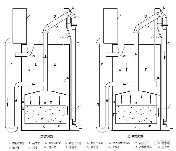 反洗流程:濾池運(yùn)行初時(shí)比較清潔,隨著運(yùn)行時(shí)間的推移而濾層表面顆粒雜質(zhì)逐漸增多,水頭損失也隨之增加,水位將沿著虹吸上升管慢慢升高,當(dāng)水頭損失增加到一定程度后,虹吸上升管中的水位上升到虹吸輔助管口并從輔助管口急速流下,依靠水流的挾氣和射流作用及抽氣管將虹吸管中的空氣帶走,使虹吸管形成真空,虹吸上升管中的水就大量地越過(guò)管頂沿虹吸下降管落下。即開(kāi)始了反沖洗過(guò)程。清水區(qū)的水經(jīng)過(guò)連通管、集水區(qū)和配水裝置從下而上沖洗濾料層,當(dāng)清水區(qū)的水位下降到虹吸破壞裝置時(shí)(約5min左右),虹吸被破壞而沖洗過(guò)程結(jié)束,過(guò)濾又重新開(kāi)始。