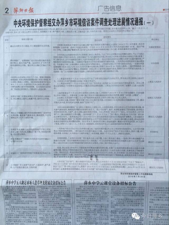 中央環(huán)境保護督察組對萍鋼、中材水泥、正大陶瓷等企業(yè)處理進展通報(5人(成人1人、小孩4人)血鉛超標)發(fā)表時間:2016-07-29 23:00 中央環(huán)境保護督察組交辦萍鄉(xiāng)市環(huán)境信訪案件調查處理進展情況通報(一) 自2016年7月14日中央環(huán)境保護督察組進駐江西以來,截至2016年7月26日,已分6批向我市交辦14件環(huán)境信訪問題,其中重點信訪件11件。截至7月27日,已辦結9件,其中,對3家企業(yè)責令立即改正,限期整改5家,停產(chǎn)整改3家,立案處罰3家,立案偵查1家,行政約談2起。現(xiàn)將已辦結的9件信訪件公布如下: 序號舉報主要內容查處情況 查處結果責任單位 1建議關閉萍鄉(xiāng)市小煤窯,中小煤窯破壞生態(tài)環(huán)境。1、根據(jù)《國務院關于煤炭行業(yè)化解過剩產(chǎn)能實現(xiàn)脫困發(fā)展的意見》(國發(fā)〔2016〕7號)文件要求,我市將按照煤礦主動申請、政府引導退出的原則,計劃在2016年至2018年三年內關閉退出煤礦60家,退出產(chǎn)能301萬噸。2、通過煤礦整頓關閉、加大礦山生態(tài)環(huán)境保護和煤炭治超工作力度,有效改善我市生態(tài)環(huán)境。市煤炭管理局 2萍鄉(xiāng)鋼鐵廠、安源鋼鐵廠經(jīng)污染治理設施改造后依舊粉塵、廢水污染嚴重。運送炭灰、礦石的大車致使道路揚塵污染,建議將企業(yè)搬遷至偏遠下風口。1、針對該企業(yè)的超標排污行為,環(huán)保部門依法立案查處,下達了責令立即整改和限期整改通知,予以了罰款以及按日連續(xù)計罰的行政處罰。2、依法查處廠區(qū)內的道路揚塵污染,責令該公司積極采取措施治理揚塵污染,配置了環(huán)衛(wèi)清掃隊伍,全天對道路進行清掃。3、加大環(huán)境監(jiān)管力度。一是從目前的濃度控制調整為濃度與總量雙重控制,嚴格控制其污染物排放總量。二是督促并要求其對環(huán)保治理設施進行提標改造。三是利用在線監(jiān)控系統(tǒng)實施遠程監(jiān)控。四是督促開展工業(yè)堆場整治,加強生態(tài)防護屏障的建設。4、責成萍安鋼公司開展污染綜合防治。一是建設兩套處理規(guī)模分別為320t/h和360t/h的污水集中處理設施,限期于2016年10月份投入使用。二是對萍鋼煉鐵1#高爐礦槽除塵、4#高爐礦槽除塵、萍鋼煉鋼一次除塵等10套環(huán)保設施進行改造,限期于2016年年底完成改造。三是新修一條廠區(qū)內原燃料運輸專用道路,以縮短物料運輸路程,減輕道路揚塵污染。市環(huán)保局 3中材萍鄉(xiāng)水泥有限公司近幾個月來,氮氧化物排放數(shù)據(jù)造假,采取遠程控制脫硝裝置儀表顯示數(shù)據(jù),將儀表顯示數(shù)據(jù)人為降低,實際脫硝裝置使用的是自來水。7月13日,市縣環(huán)保人員突擊檢查,抓住現(xiàn)行,作弊電腦等已被市環(huán)保局收繳,但當?shù)卣碍h(huán)保部門考慮國企影響較大,不愿意深入追查此事。1、上栗縣環(huán)保局于7月21日對該公司下達了《責令改正違法行為決定書》,責令該公司立即停止違法行為。目前該公司煙氣脫硝除塵設施已恢復正常運行。 2、上栗縣環(huán)保局于7月22日對該公司下達了責令改正、處罰款伍拾萬元的行政處罰事先告知書。并向上栗縣公安局移送了中材萍鄉(xiāng)水泥有限公司篡改在線監(jiān)測數(shù)據(jù)案。上栗縣公安局依法受理了該案件,已進入法定程序。 上栗縣人民政府 4安源區(qū)華夏三信置業(yè)有限公司開發(fā)的優(yōu)山美域小區(qū),附近橫龍公園的山地遭開挖,破壞生態(tài)環(huán)境。1、城郊管委會于7月22日責令該項目立即停止施工,并限期于2016年7月31日前完成截溝、沉淀池建設,否則不得復工。并要求復工后增大施工現(xiàn)場及車輛運輸通道灑水頻次和范圍,做到"全時段、全覆蓋"。 2、安源區(qū)水務局責令華夏三信公司嚴格按照批復的水土保持方案實施,防止水土流失。 3、安源區(qū)住建、環(huán)保部門要求華夏三信公司合理開發(fā)用地,切實做好小區(qū)及周邊綠化和植被修復工作,建設開放式游步道,供市民游覽休憩,做到"還綠于民"。安源區(qū)人民政府 5湘東區(qū)下埠鎮(zhèn)紅溪村軍來組婧鋅塑料廠沒有環(huán)保處理設施,廢水廢氣廢渣直排,臭味擾民,并且導致附近約20個小孩鉛中毒。村民反映的婧鋅塑料廠應為萍鄉(xiāng)市精鋅化工有限公司。1、經(jīng)現(xiàn)場調查,村民反映該公司無環(huán)保處理設施,廢水廢氣廢渣直排,臭味擾民問題與實際情況有出入。該公司對廢氣、廢水、廢渣配套建設了防治措施,基本能達到國家排放標準,但廢氣、廢水出現(xiàn)過超標排放的現(xiàn)象。對此,環(huán)保部門依法進行了查處。 針對近期該公司外排煙氣中二氧化硫超標行為等問題,一是環(huán)保部門于7月22日下達了"停產(chǎn)整治,并擬處六十萬元罰款"的行政處罰事先告知書。二是責成該公司于2016年8月31前完成對地面徑流雨水收集池的擴容整改。三是加強對該公司的環(huán)境監(jiān)管,確保廠區(qū)周邊群眾的環(huán)境安全。 2、關于村民反映約20個小孩鉛中毒問題。經(jīng)調查,湘東區(qū)近期未接到當?shù)卮迕翊祟悊栴}的反映。2015年8月,曾有村民反映小孩血鉛超標,橫溪村安排周邊村民38人進行了篩查,發(fā)現(xiàn)5人(成人1人、小孩4人)血鉛超標,經(jīng)醫(yī)院治療后,5人血鉛值均回歸正常水平。湘東區(qū)人民政府 6安